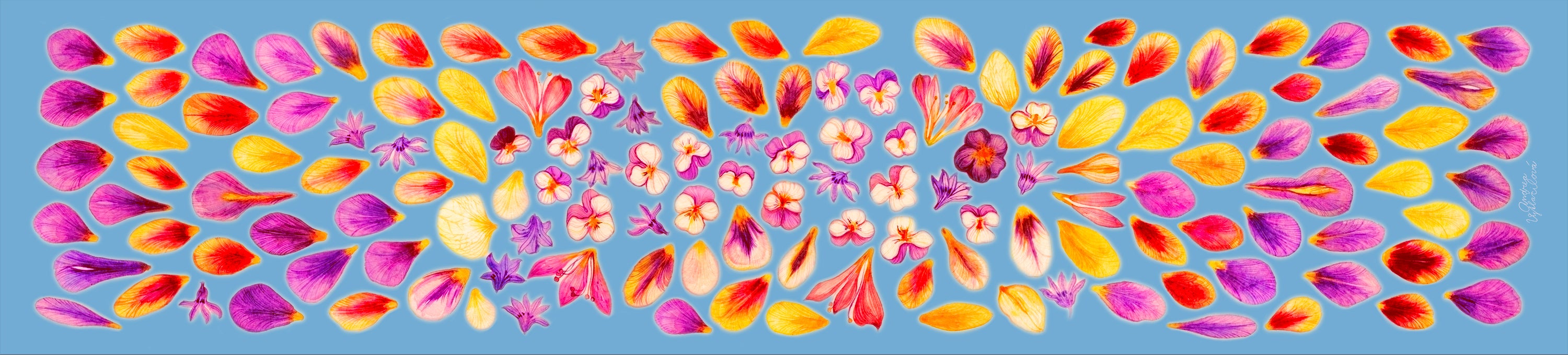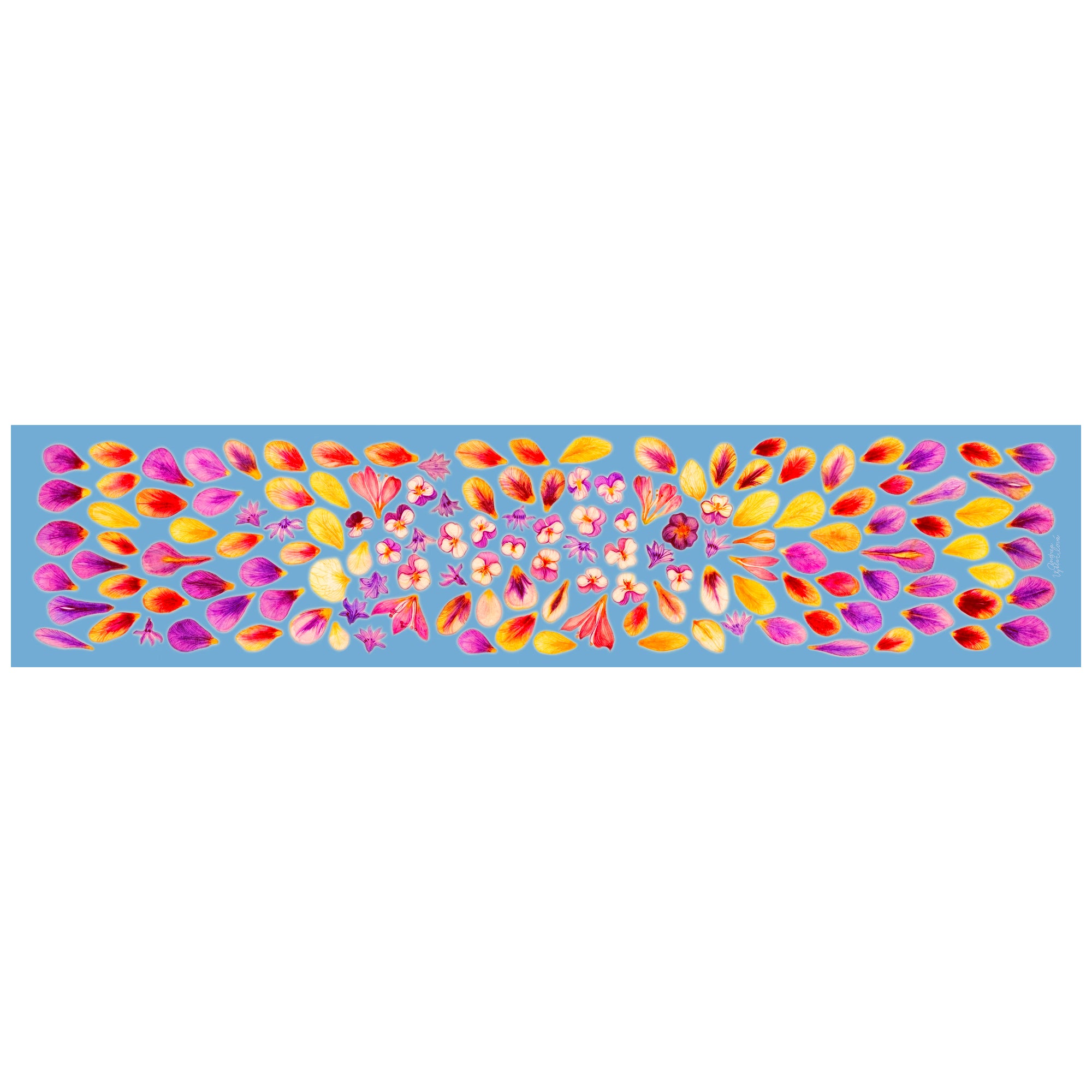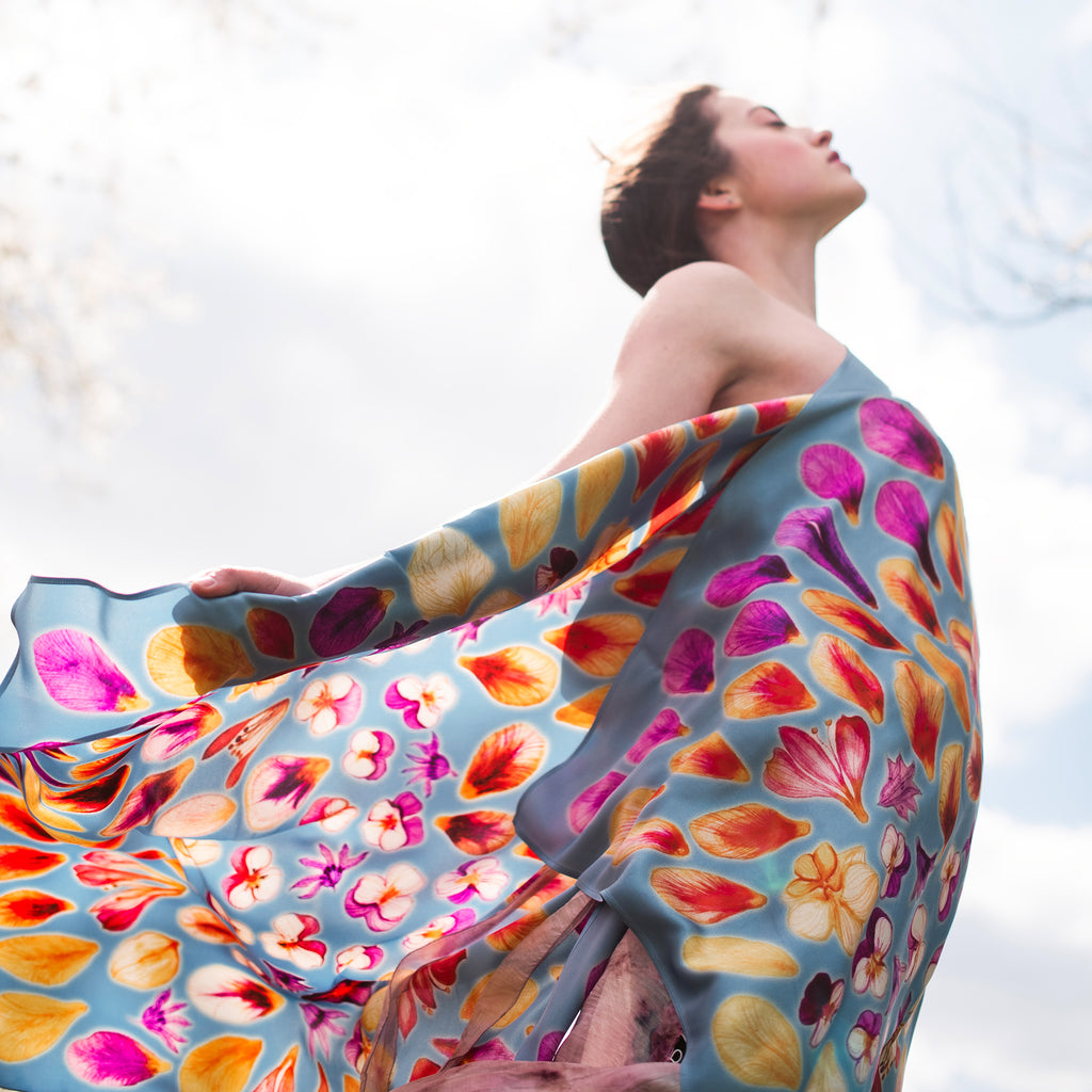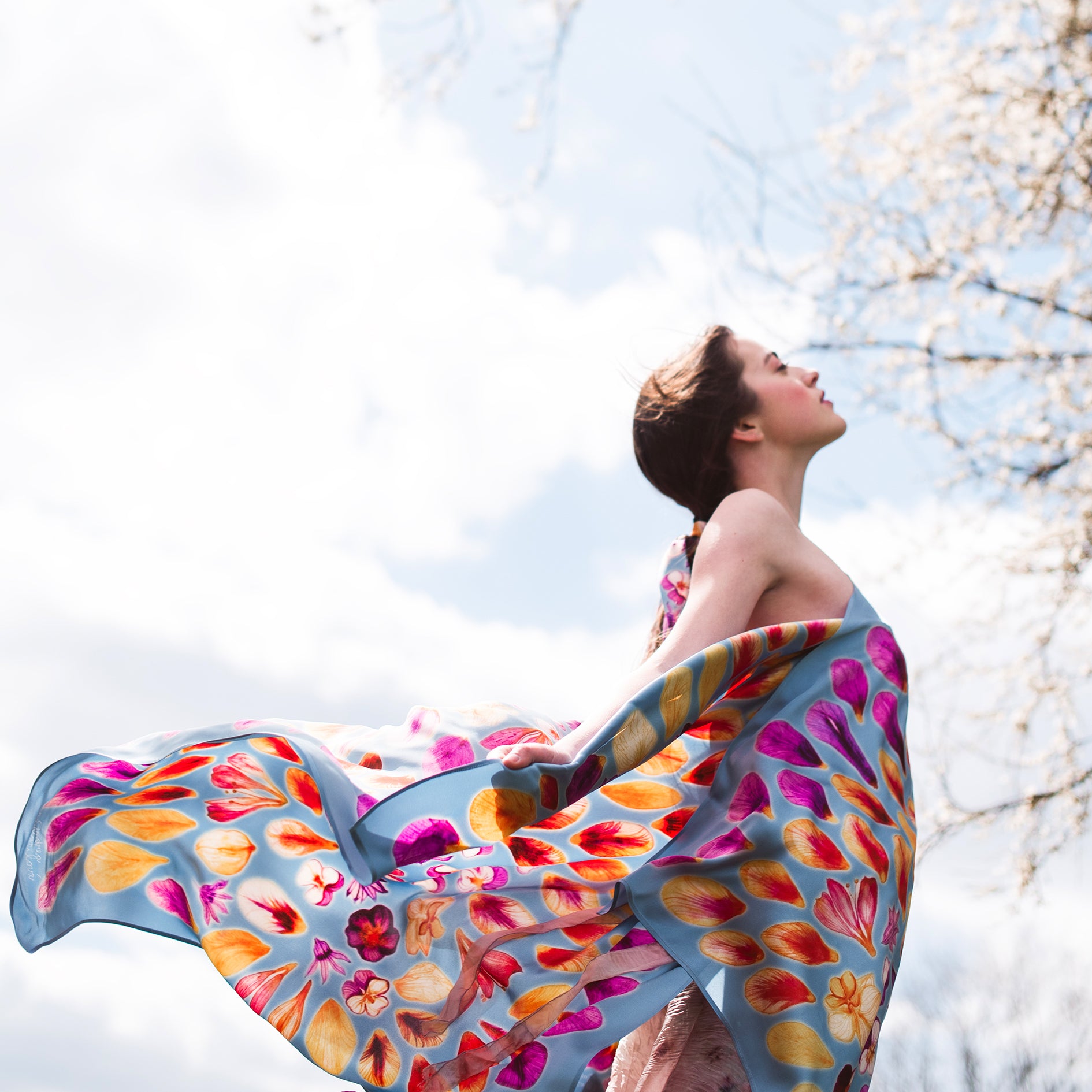 Hedvábný šál SKLIZEŇ odráží mou lásku ke květinám, k probouzející se přírodě a hřejivým paprskům jarního slunce. Šátek je inspirován uchováváním květin v herbářích. Oslavme ženy a lásku šátkem plným barevných kvítků, který obejme celé tělo.